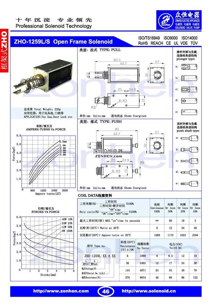 ZHO-1259 用于玩具槍,門鎖等直線推拉式電磁鐵